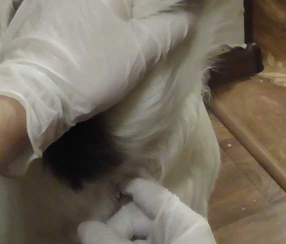 - Рядом с анальным отверстием нужно найти две ямочки (если представить анальное отверстие часовым цыферблатом, то железы будут соответствовать 5 и 7 часам). Чистить железы лучше перед купанием, поместив собаку в ванну. Левой рукой максимально отводим хвост собаки к спине, чтобы приоткрыть протоки желез. Правой рукой при помощи салфетки двумя пальцами слегка надавливаем на обе стороны анальной области. Выделившийся секрет удаляем салфеткой и приступаем к мытью собаки.