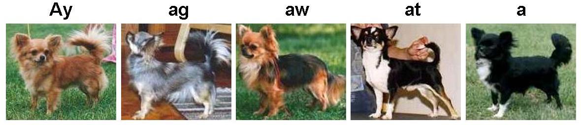 Локус A (ASIP) имеет 4 аллеля, о которых можно сообщить: ay, aw, at и a. В отличие от локуса K, который имеет один доминантный и один рецессивный аллель, локус A имеет иерархию аллелей, аналогичную локусу E. Аллель ау (палевый или собольий) доминирует над всеми другими аллелями А, а aw (агути или волчий соболь) доминирует над at (черно-подпалый) и a (рецессивный черный).
