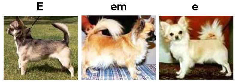 Локус E (MC1R) имеет 4 аллеля, о которых можно сообщить: Em, Eg, E и e, и это имеет иерархическую структуру доминирования. Em (меланистическая или темная маска) находится вверху и доминирует над другими аллелями E. Это характерная лицевая маска, которую можно увидеть у немецких овчарок и мопсов. Например, (серый) стоит на очереди и выглядит как вдовья пика афганца. Физическая видимость маски или гризли зависит от генотипов в локусах K и A. Например, для того, чтобы гризл проявлялся фенотипически, собака также должна иметь генотип kyky в локусе K и atat в локусе A.