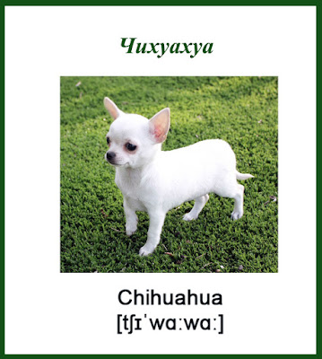В испанском языке латинская h является «немой» буквой, то есть она никогда не читается, однако в России название Chihuahua читали на английский манер, поэтому в русском языке устоялось неверное название «чихуахуа», при этом в современном английском языке название породы произносится, как и в испанском языке, также без звука [h], то есть [tʃɪ.ˈwɑ.wə].