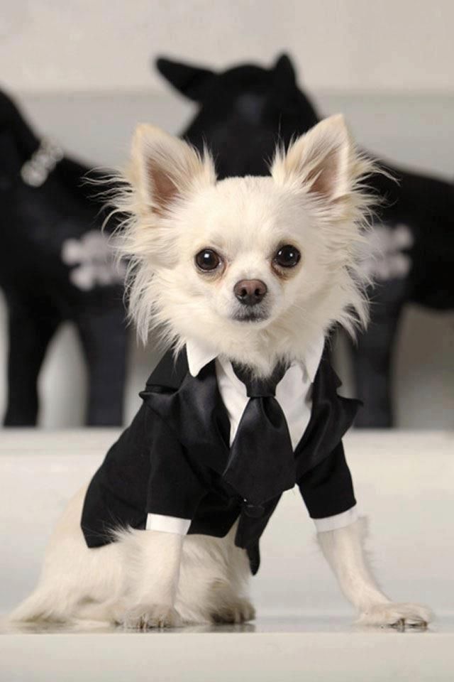 Смокинг от модного бренда Little Lily. На чашке с кормом написано «убийца». (Phil McCarten | Reuters):