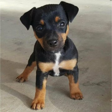 Такой пес вырастает больше, чем чихуахуа, имеет черный с подпалинами окрас, большие и острые уши и короткий хвост (длинный встречается крайне редко) – все это гены карликового пинчера. Но встречаются также и золотистые метисы.