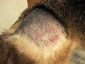 - Реакция инородного тела. Стекло, а иногда и жесткая сбитая шерсть животного способны стать причиной воспаления. Вместе с потерей шерсти наблюдается набухание и воспаление облысевшей кожи. Такое состояние часто развивается меж пальцами собаки. Для лечения этого явления может потребоваться хирургическое вмешательство. Операцию проводят под анестезией для избавления от инородного тела или другого раздражителя. Также распространено применение антибиотиков, если есть вторичная бактериальная инфекция.