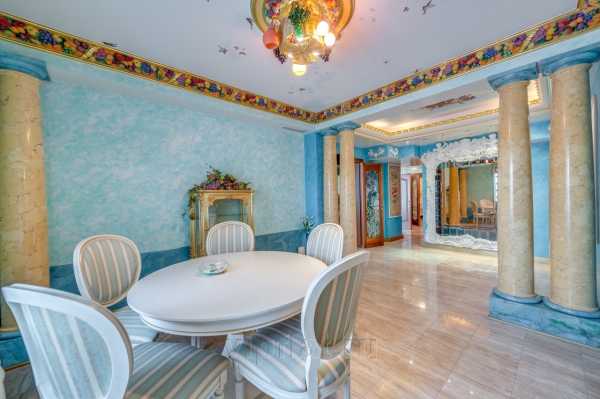 04. Дальше мы проходим в гостиную. Глядя на это фото, я понял, что меня больше всего раздражает в агрогламуре — это, пожалуй, несочетаемость цветов. Посмотрите на зеленую полуколонну справа от двери, а затем на синюю стену за дверями — вот такие несочетамые цвета из разной части спектра и создают тошнотный колхозно-провинциальный интерьер, напоминающий ремонт в сельском облисполкоме. Про павлинов на потолке и расцветшие там же полиуретановые розы я скромно промолчу.