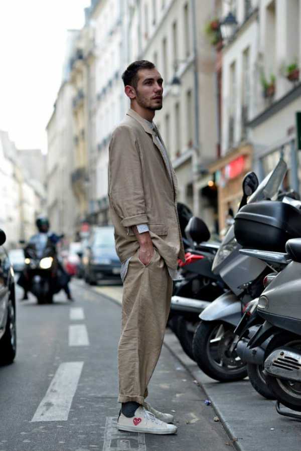 Если неумело подобрать такой дуэт, то образ будет напоминать продавца, который обул кроссовки, чтобы выгрузить ящики. Выбирай костюмы приглушенных, лучше темных тонов, без замысловатого дизайна. Кроссовки должны быть качественными, кожаными с минимальным декором или без него.