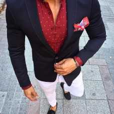 Casual пиджак темно-синего цвета в сочетании с бордовой рубашкой, белыми джинсами и темно-синими мокасинами. Из аксессуаров: красный нагрудный платок с фантазийным рисунком, кожаный браслет темного цвета.