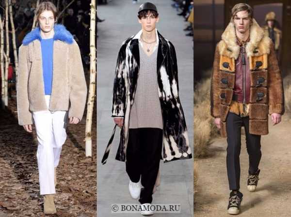 Мех в мужском гардеробе становится всё более выразительным, а образы с ним – более дерзкими и смелыми. Чаще всего в коллекциях можно увидеть именно искусственный мех, как нейтральный бежево-коричневый, так и цветной.