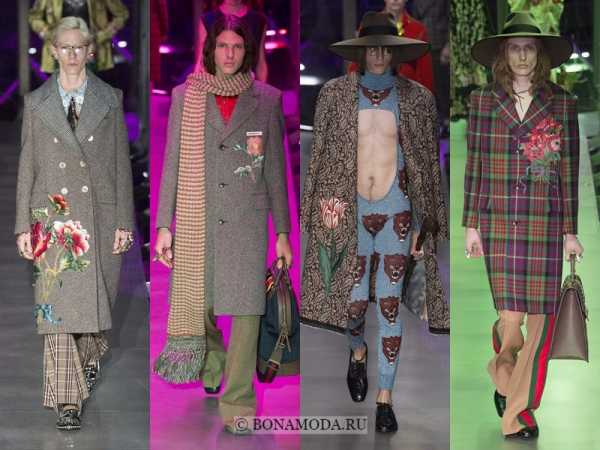 Gucci по старой-доброй традиции удивляет и шокирует, демонстрируя новые открывающиеся возможности для стиля унисекс, где, впрочем, женственного больше, нежели мужского или универсального. Звёздами коллекции стали клетчатые мужские пальто, модели с цветочными патчами.