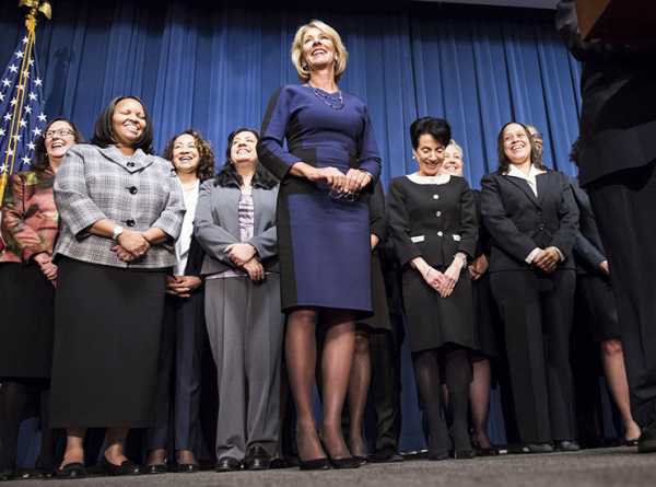 Примерно такой же месседж у Бетси Девос. Англоязычная версия википедии гласит, что она"бизнесвумен, филантроп и политик», а в русской версии к этому прибавляется еще слово"миллиардер». Возможно, этот факт сыграл определенную роль в том, что 59-летняя Бетси всегда выглядит цветущей, отдохнувшей и не отягощенной проблемами национального образования, за которое она отвечает в кабинете Трампа.