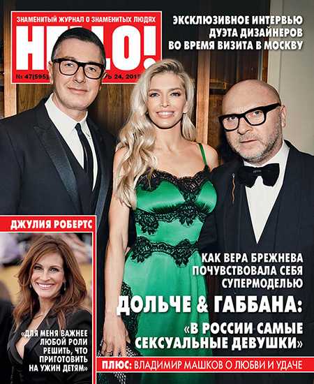 Обложка №48 HELLO! c Доменико Дольче, Стефано Габбана и Верой БрежневойИтальянские дизайнеры Доменико Дольче и Стефано Габбана в конце октября прилетали в Москву на открытие нового бутика. О своей долгоиграющей истории любви с Россией они рассказали в интервью HELLO!