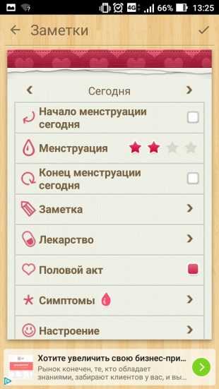 - «Заметки» — обширный перечень того, что с вами может произойти в течение дня. Начало и конец менструации, интенсивность кровотечения, приём контрацептивов и других медикаментов, защищённый или незащищённый половой акт (с оргазмом или без), симптомы, настроение, тест на овуляцию, вес и температура. Добавляя в календарь заметку «Половой акт», вы увидите прогноз оргазма. Здесь же открывается доступ на женский форум, где общаются пользователи приложения.