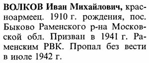 ОБД: род.1901, призван Петушинским РВК, стрелок 126-го стрелкового полка 71-й стрелковой дивизии, пропал без вести 3.1.44 д.Троянов Трояновского р-на Житомирской обл., жена Наталия Ивановна, Петушки, ул. 1 Мая, 68.