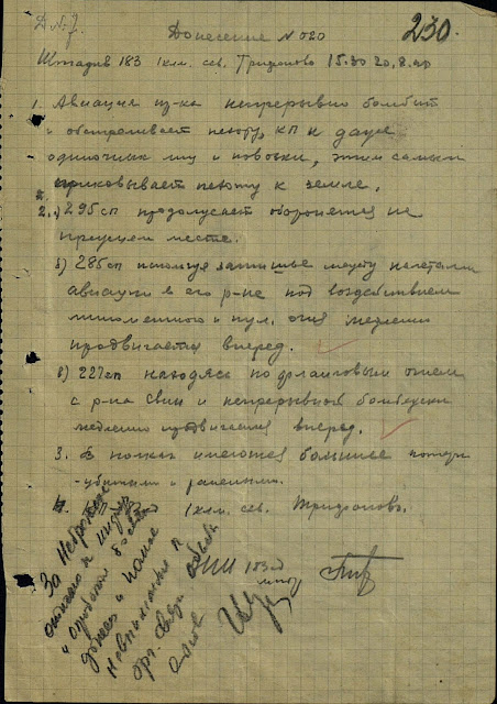 Первый документ дивизии после выхода из окружения – донесение командира 227-го стрелкового полка ст. батальонного комиссара Д. К. Касьяненко командующему 29-й армией: «Доношу, что 21.II.42 вышел с тыла противника и временно вступил в обязанности командира 183 сд до выхода с тыла противника командира дивизии генерал-майора Комиссарова. Формирую временное управление дивизии и полки. Наличный состав дивизии занимает оборону – 285 сп в районе выс. 232, 9, эшелонирован в глубину 227 сп, 295 сп, 623 ап… в районе д. Высокое». К вечеру этот дня штаб дивизии располагался в д. Ключи, связь со штабом армии и соседями осуществлялась «пешими посыльными».