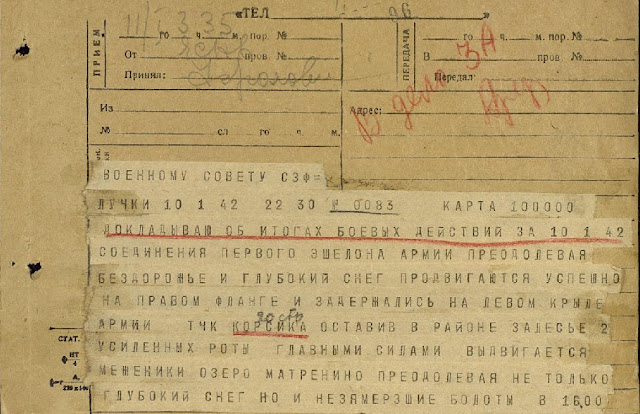 Решение на 11.01.42г. Я решил: - 23 СД главными силами овладеть Молвотицы; - 33 СД главными силами выйти на дорогу Ставни, Луг, Рудаково; - 257 СД овладеть р-ном Пустынка, Люшино и 31 СБР - р-н Восшагиха, Володарское, Шумского; - 20 СБР - Шепелево, Теплынька; - 27 СБР - Гнутище, Шабаново. Ком. войск армии г-л Туркаев. Гл. воен. сов. бр. ком. Рязанов. Нач. штаба г-м Покровский. Лист 7. Доклад к утру 12.01.42г. 20 СБР главными силами вышла в р-н к югу от Межники. 23 СД - 3 км зап. Палагино. 33 СД, достигнув рубежа Кожино, Кадниково, Мелихово, Дорофеево, част. 73 СП и 164 СП ведет бой за Мамоновщина, готовится к наступлению в общем направлении на Сысоево. 257 СД к исходу 11.01.42г. - 1 км вост. оз.Ягодник, отм.224,5 сев. берег оз.Стерегут. Готовится к наступлению в направлении Горбово. 31 СБР овладела Шепелево, вела бой за Коковкино. Командующему Калининским фронтом. В связи с нашим передвижением на юго-зап. положение Демянской группировки пр-ка становится все более угрожающе глубоким коммуникац. и базам 3 УА. Поэтому считаю необходимым всемерно форсировать начало активной операции против этой группировки. 20.01.1942