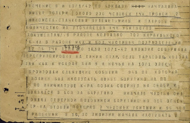Лист 10.Командующему Калининским фронтом.Итоги боевых действий за 27.01.42г.23 СД, сменив батальон 42 СБР на участке Гусево, Наумово, вела в течение дня напряженные бои сев. и сев.-вост. Молвотицы с пр-ком, наступавшим от Бель 1-я. К вечеру части дивизии рассеяли пр-ка и отбросили к Бель 1-я.Наибольшую активность пр-к проявил в направлении Холм с зап. и юго-зап.33 СД - с утра 27.01.42г. пр-к перешел в наступление из р-нов Пронино вдоль большака Куземкино - Холм. К 11.00 до 600 чел. пр-ка.С артиллерией при поддержке авиации прорвались в Холм. В городе идет напряженный бой.Командиру дивизии приказано выяснить на месте обстоят. пр-ка и привлечь виновных к строгой ответственности. Одновременно дано указание оставить прикрытие на сев.-зап. и сев. окраинах города. Основные силы сосредоточить южн. Холм с задачей разгрома пр-ка, действующего в р-не Пронино - Куземкино, и вновь занять зап. часть Холм, наступая с зап.28.01.42г. в дивизию выезжает член Военного Совета.54 СБР - приказ: к утру 28.01.42г. выйти в р-н Поколоты - Качаново, Хомягино с задачей перехватить большак Локня, Холм, нанести удар в тыл пр-ку. Лыжный батальон, приданный бригаде, остается в р-не Самушенка и ведет разведку в сев. и зап. направлениях.257 СД - приказ: перейти к активным действиям с целью к исходу 29.01.42г. совместно с 3 СБР овладеть Великие Луки.Поступили вновь прибывшие 391 и 130 СД и 154, 86 СБР. После выгрузки сосредоточились в следующих р-нах: 391 СД - Полганово, Сухая Нива, Владычно (6-8 км юго-зап. Молвотицы).86 СБР - Луг, Рудаково, Перхово (6-8 км южн. Молвотицы).Лист 14.Тов. Коневу (ком. Калининским фронтом).Итоги боевых действий за 31.01.42г.Войска армии, обороняющиеся на правом фланге, продолжают активные действия в р-не Холм и Великие Луки.Пр-к, оказывая всюду активное сопротивление, продолжает сосредоточивать свои силы в р-не Локня.33 СД - частыми атаками улучшала свое положение. Дивизия получила возможность использовать 73 СП для атаки Холм с запада.45 СБР овладела Пронино, перехватила дорогу Холм - Локня, и тем самым обеспечивала 33 СД от прорыва пр-ка с запада в Холм. Одним батальоном продолжала очищать от пр-ка р-н Тараканово.Пр-к ведет настойчивые атаки вдоль дороги Локня - Холм.Лист 16.Пр-к оказывает упорное сопротивление Холм. В р-не Хворошино, Тараканово, Максимово, Марково пр-к сосредоточил новые части. В р-не Беженицы, Локня скопление войск пр-ка неустановленной численности. Пр-к стремится освободить и усилить Холмскую группировку, одновременно производя в ряде мест саперные работы по р.Ловать33 СД и два СП 391 СД ведут бой в г.Холм.45 СБР обороняет фронт Пронино, Скаруево, Луг.54 СБР обороняет Худяки, Рысцово, Погоренка.26 СБР выставил заслон в сторону Груздово, 38 СБР через Поддорье, Вичевицы наступает на Ратга и далее на Беженицы.8 ГСД через Шапково, Какачево, выходит в р-н Мазуры (12 км зап. Холм), откуда после разгрома пр-ка совместно с 75 и 45 СБР в р-не Хворощино, Максимово, Сопки наступает на Замошье и далее на Локня.54 СБР обороняет р-н Маслово, Рысцово, Погорельцы, Малкино с подходом 45 СБР, 33 СД переходит в наступление на Селебино. Дальше совместно с 33 СД наступает зап. р.Ловать на Великие Луки, Новосокольники.33 СД по овладении Холм наступает за 45 СБР для содействия по разгрому пр-ка Темный Бор, Язвы.Справка.С 7 по 24.03.42г. по карте боевых действий 33 СД видно, что в р-н г.Холм были подтянуты дивизии: 75 СД - д.Иваньково (сев.-зап.), 37 СД - д.Куземкино (ю