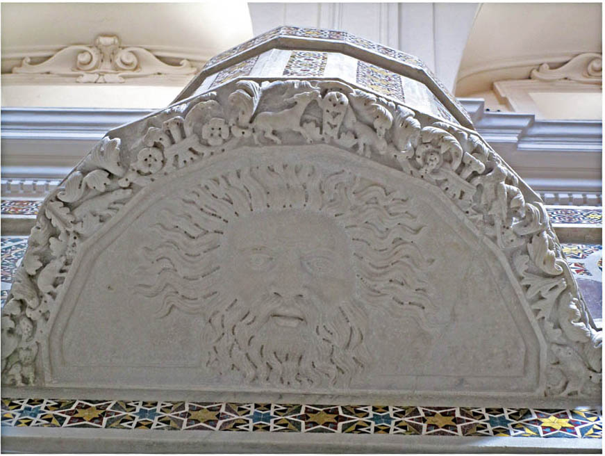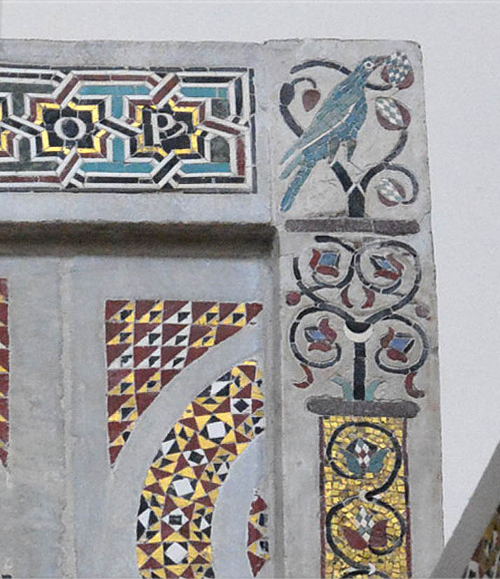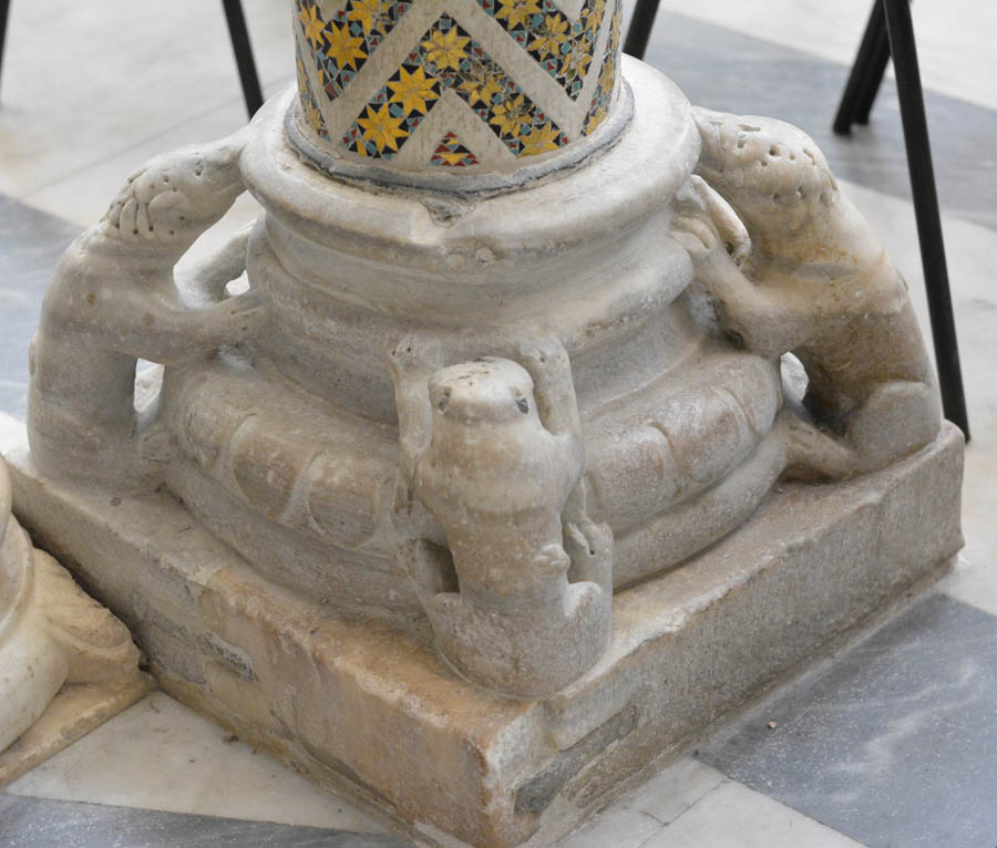 Второй - правый амвон Собора Салерно назван в честь архиепископа Никола д'Айелло, одного из сыновей сицилийского канцлера Маттео д'Айелло. Он опирается на 6 колонн, их капители поскромнее - только одна с человеческими фигурами, остальные - с птицами, маскаронами, рогами изобилия и растительными мотивами. Здесь тоже есть очень интересная скульптура, которую непременно рассмотрим.Мозаики этой кафедры более разнообразны, чем на амвоне Гуарно. Мне понравилось, что итальянская Вики не назвала их "косматеско", а честно призналась, что мотивы орнамента византийские в бесконечном разнообразии вариантов:-)