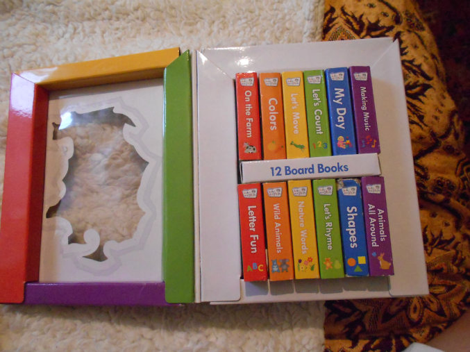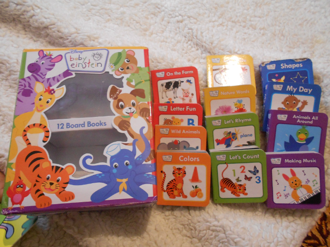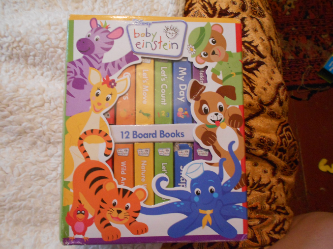 12 книжечек,все практически перекликаются с темами видео Бэби Эйнштейн - фигуры, цвета, давай посчитаем, рифмы, животные на ферме, животные вокруг, кто где живет...