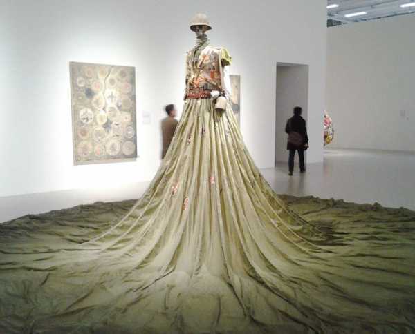 Роль русской, взятая на себя 23-летней немкой в Америке, была маркетинговым, как мы сегодня сказали бы, ходом. Но при этом в «легенде» Верушки отчетливо проступили черты, которые тридцать лет спустя появятся в автопортретах Веры фон Лендорф. Верушка была не только «битником с Парк-авеню», то есть персонажем новой молодежной интернациональной культуры, но и существом из чужого мира. В 1960-е этот чуждый новый мир на фотографиях в модных журналах сливался, с одной стороны, с азиатской или африканской экзотикой, с другой – с футуристическим «луком» от Андре Куррежа. В середине 1990-х, когда Вера фон Лендорф делает свои автопортреты, образ «чужого» радикализируется. Появляются Человек-паук и манекен, убегающий из витрины, зебра в джунглях Нью-Йорка, панк с колючими отростками ирокеза («Антенна»), скульптура, напоминающая работы Генри Мура, и безволосая инопланетянка в серебристых одеждах на фоне свалки… В 1990-е образ «чужого» тиражирован поп- и масскультурой. Но Вера фон Лендорф была одной из первых «пришельцев» из мира «чужих». «Защитные цвета» боевой раскраски были маской, но и выражением отчужденности, отчаяния существа «не отсюда». Средством выражения становится пластика тела, которое она, кажется, буквально готова завязать узлом или превратить в иероглиф, плюс… наряды кутюрье, сделанные специально для ее проектов. Среди самых впечатляющих – тяжеленная шинель от Кристиана Лакруа для «Женщины, пережившей мировую войну в Европе». Ее не привезли в Москву, зато привезли костюмы «змеи» и платье, где в прозрачный воротник вставлены СD-диски.