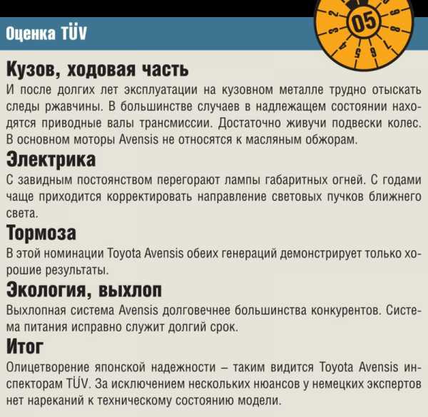 Судя по статистике TUV, запаса жизненных сил Avensis с лихвой хватает на многие годы. Даже в преклонном возрасте Toyota редко преподносит неприятные сюрпризы. Подтверждением тому и статистика немецкой службы технического контроля TUV, которая проводит техосмотр машин в Германии. В соревновании трехлеток Avensis на 12-м месте из 125 возможных — техэкзамен с первого захода завалили всего-то 3,2% машин. Такой же результат у одного из главных конкурентов, Mazda6, а также у Porsche Boxster, Opel Meriva и Ford Focus. В пяти- и семилетнем возрасте Avensis на 15-й строчке рейтинга, а девятилетки удерживают 9-ю позицию.