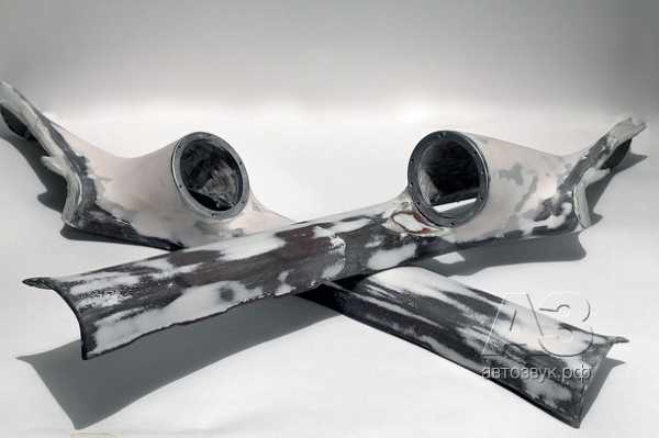 Пора было приступать ко второй паре подиумов. Если ВЧ-подиумы выполнены по «пенно-смольной» технологии, то СЧ — по не менее классической «чулочно-смольной». Так же был сделан каркас из колышков, так же с ориентированием динамиков «в лицо». После каркас обтянут чулком и промазан смолой. После высыхания — шпатлёвка и внутри для прочности, и снаружи и обработка поверхности для обтяжки кожей. В левом подиуме пришлось делать вогнутость, иначе динамик «в лицо» не смотрел. Среднечастотники играют на объём примерно 0,65 л в полосе 630 Гц — 4,5 кГц. При выборе объёма поэкспериментировал: при минимальном (около 0,1 л) звучание показалось глуховатым, несвободным. При работе на весь объём, который есть под накладкой стойки (там наверняка больше литра будет), звук был каким-то невыразительным. В результате остановился на 0,65 л, для чего сделал из поролона перегородки внутри подиума. Готовые подиумы сдал в ателье для обтяжки кожей. То же ателье, где был перешит в кожу весь салон. Мечтать, так мечтать…