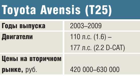 Avensis — один из самых плавных и тихих автомобилей семейного класса. Российские дилеры продавали бензиновые модификации с моторами: «обычными» 1.8, 2.0 и с непосредственным впрыском топлива — 2.0 D-4 и 2.4 D-4. Двигатели работают в тандеме с 5-ступенчатой МКП и 4-диапазонным «автоматом». Самую же мощную модификацию 2.4 (163 л.с.) оснащали 5-скоростной АКП. В Европе в почете дизельные вариации мощностью 116 и 177 л.с.