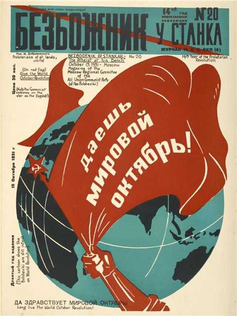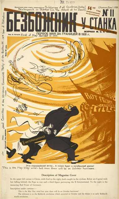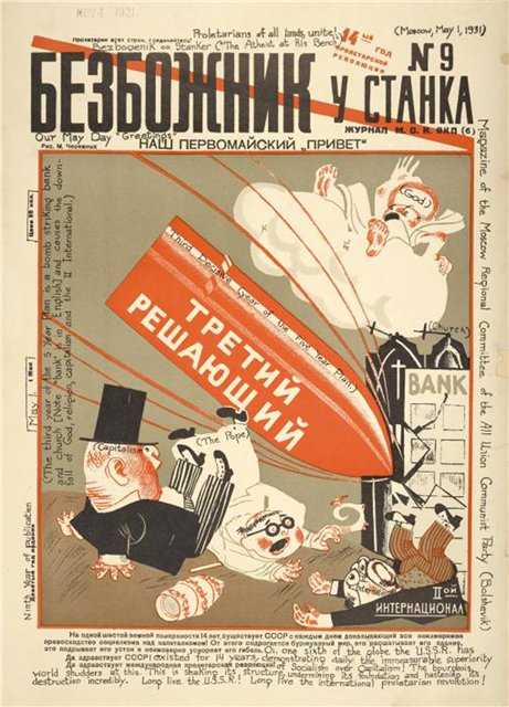 Первомайский номер советского антирелигиозного иллюстрированного журнала «Безбожник у станка» за 1926 год. Цена — 40 копеек. Главный иллюстратор — Дмитрий Моор. 22 страницы. На обложке журнала в рисунке обыграна один из главных интернациональных лозунгов коммунистов «Пролетарии всех стран, соединяйтесь».