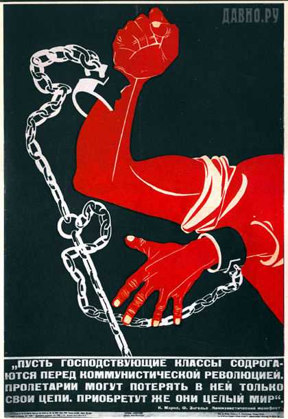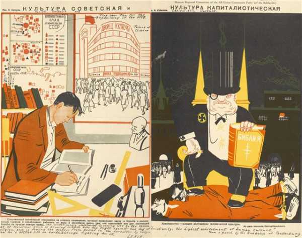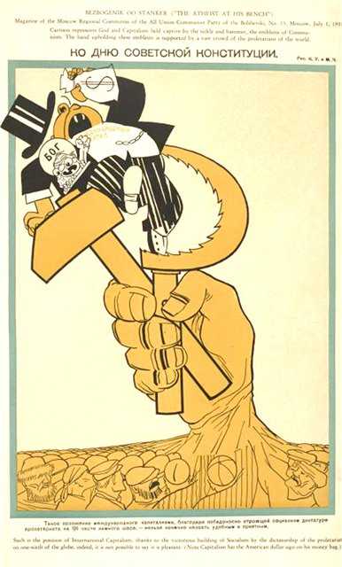 «Безбожник у станка» (1930 Ноябрь). Капиталистическая культура и её символы указывающие на угнетение трудящихся — свастика, символ фашизма, $ (доллар), как символ экономической эксплуатации, и Библия с крестом, символ христианства.