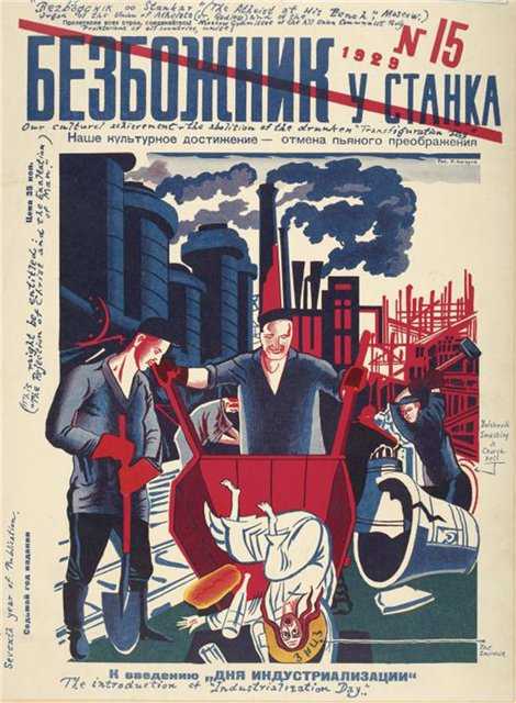 «Безбожник у станка» (1929 №15). На титульной странице изображение рабочих, вывозящих Иисуса Христа в тачке для мусора