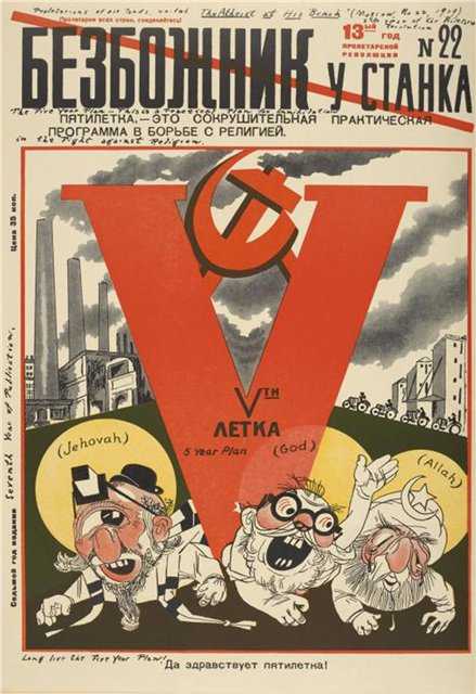 «Безбожник у станка» (1929 №22). Боги трех религий (Иудаизм, Христианство и Ислам) раздавлены первым пятилетним планом