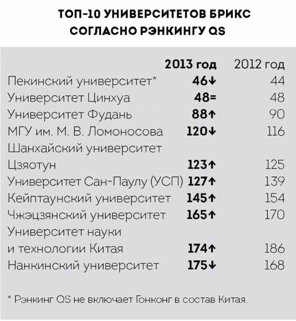 В топ-400 последнего рэнкинга от России и Индии попали по пять заведений, от Бразилии и ЮАР – по три, от Китая – 11. Из десяти лучших университетов БРИКС китайских – целых семь. Остальные три – бразильский, российский и южноафриканский вузы.