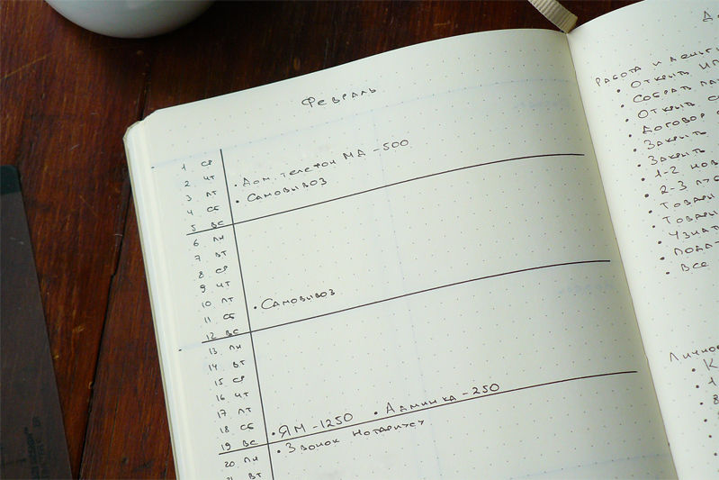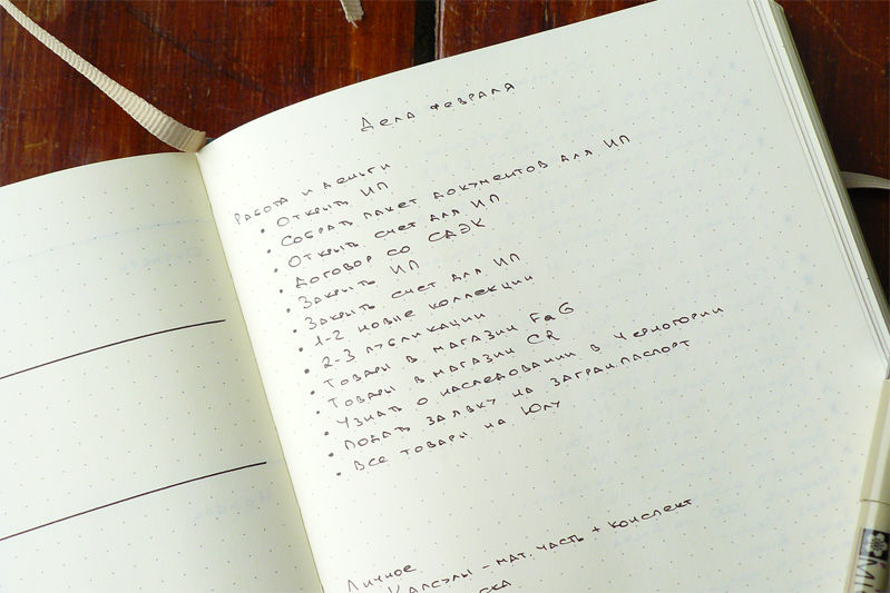 Сразу после разворота на месяц открываем новый — на день. Ставим дату и просто выписываем дела списком.