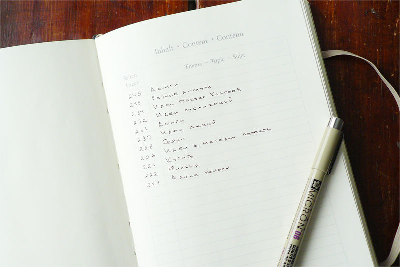 - под содержание отводится 2-3 страницы в начале блокнота;