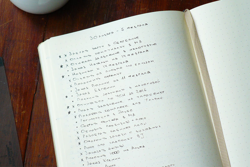 Но не хватало теплого лампового чувства, которое дает бумага и ручка. Кроме того, я заметила, что заполнять бумажные списки мне нравится больше — поставить галочку напротив сделанного дела приятнее, чем кликнуть мышкой по чекбоксу. Казалось бы, мелочь — но на продуктивность влияет очень сильно!