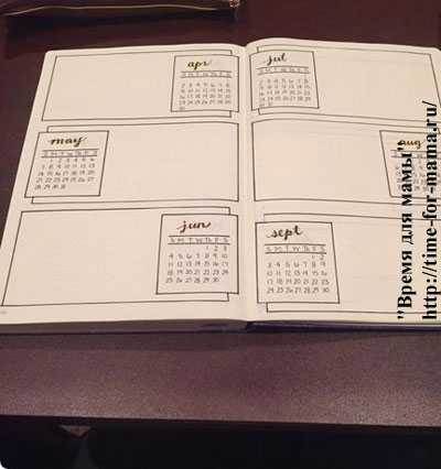 - Между вторым и третьим разворотами, кстати, может быть еще разворот полугодия – лист, разлинованный на шесть квадратов, где также будут прописаны главные пункты по каждому месяцу. Да и вообще, шаблоны ежедневника могут немного отличаться друг от друга, ведь каждый человек подстраивает развороты под себя.