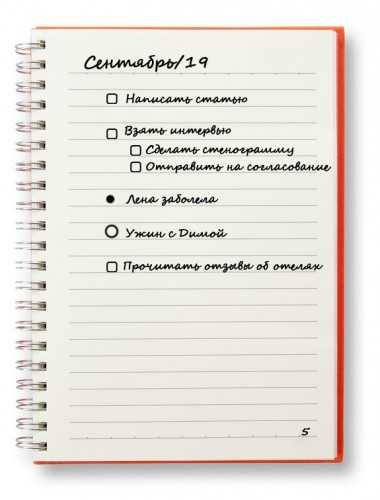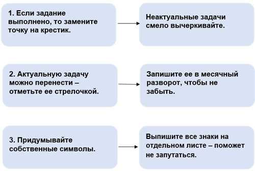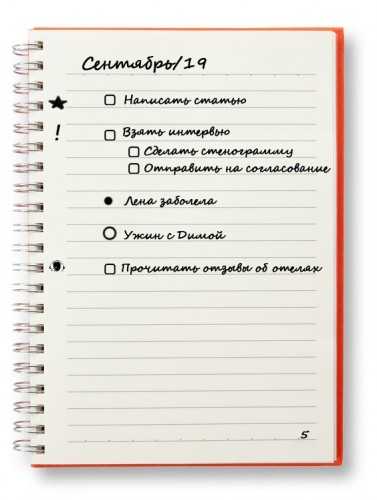 - Отмечайте выполненные задачи галочками; задачи, потерявшие актуальность, вычеркивайте.