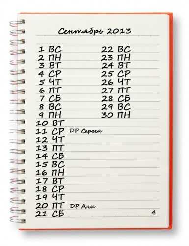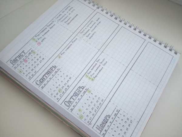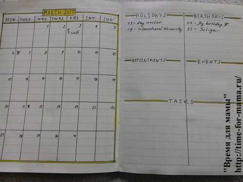 - Второй разворот – календарь. Здесь нужно прописать ключевые для вас даты: дни рождения родственников, друзей, коллег, однокурсников; даты праздников; сроки отпусков и командировок; сроки выполнения тех или иных поставленных целей, и др.