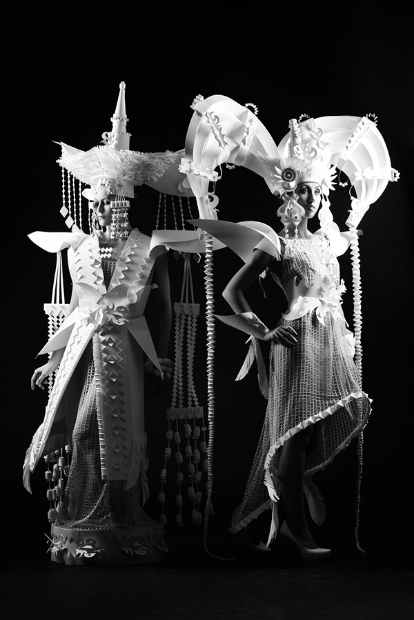 А этот бумажный костюм создан под впечатлением от искусства коренных народов Сибири. Асина команда познакомилась с традициями шаманизма, популярного в Сибири до сих пор, и внезапно сложился единый художественный пазл: костюм - образ шаманки совмещающей в себе многослойную мифологию шаманизма, тотемов, пермского звериного стиля и суровой природы Сибири.