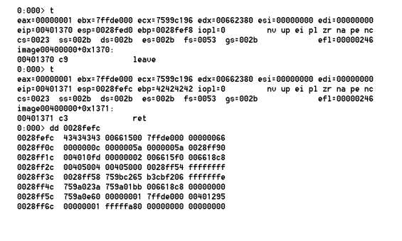 Рассмотрим, как выглядит переполнение со стороны отладчика. Снимки экрана с программой, запушенной под отладчиком Windbg, показаны на рисунках 2 и 3.