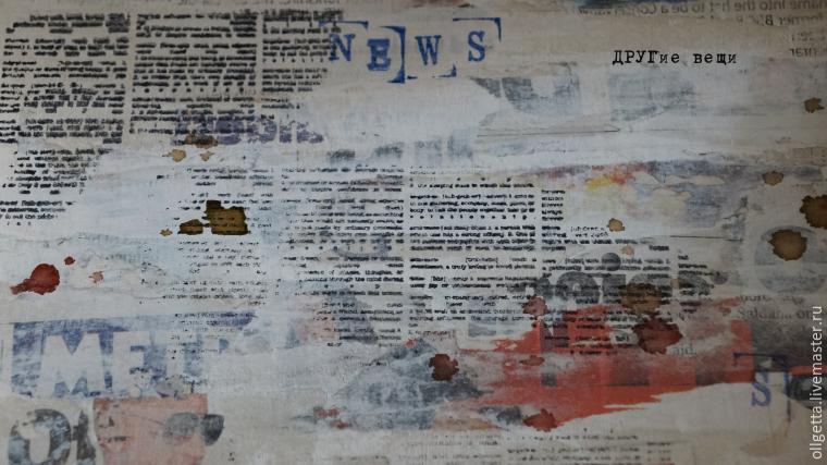 5. Чтобы усилить эффект старой стены оклеенной газетами, кое-где газетные листы обрываю. Когда грунт еще сырой, бумага легко надрывается и скатывается с поверхности. После полной просушки покрываю все тонким слоем лака. Просушиваю и немного ошкуриваю.