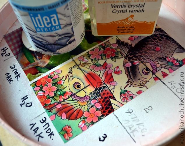 Лак я решила взять акриловый стекловидный для самой коробки и окантовки крышки, а картинку решила залить "хрустальной резиной" (еще ее иногда называют стеклянной резиной, эпоксидкой). Первый раз пробовала и то и другое.