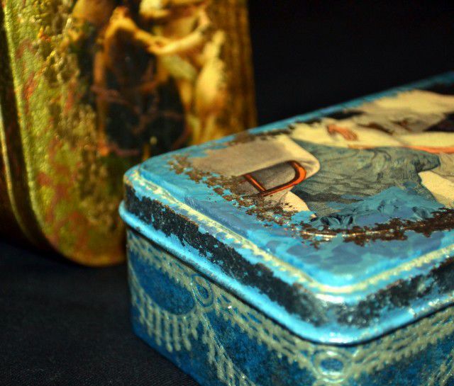 Внутри я эту коробку не обрабатываю, но можно нанести краску или проклеить тканью. Места соприкосновения крышки и стенок то же краской и лаком не покрываю. Коробка жестяная, подогнать ее для легкого открывания-закрывания (истончив шкуркой, например, как деревянную) нет возможности. А слои акрила и лака имеют свою толщину. Будут мешаться, обдираться, слипаться и всячески мешать.