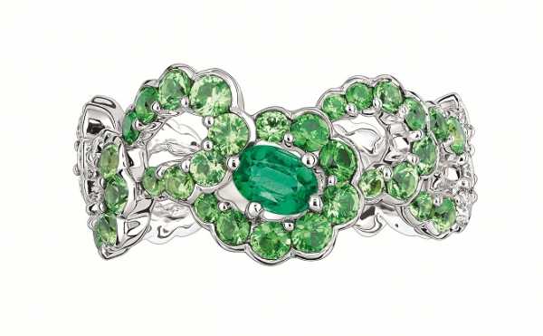 Victoire de Castellane, Creative Director of Dior Joaillerie, has designed a number of jewelry and timepieces available exclusively in the new Paris boutique conceived by Peter Marino. The numberedLa D de Dior model comes in chrysoprase, yellow gold and diamonds with a delicate green lizard strap, while the Dior VIII Grand Bal Coquette comes with a polished rose gold case set with diamonds, a malachite dial and a green alligator strap. The rotor decorated with feathers, sapphires, amethysts and diamonds is placed on top of the dial where it suggests the twirling movement of a ball gown. TheArchi Dior jewelry collection inspired by Christian Dior’s passion for architecture and in which each piece carries the name of an iconic couture line or dress welcomes five exclusive creations. The Bar en Corolle ring is reinterpreted in white and yellow gold with diamonds and emeralds, while the Milieu du Siècle necklace, two pairs of earrings and ring are revisited in white gold, diamonds, emeralds and tsavorites.