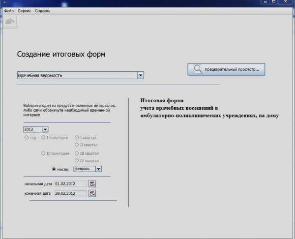 Меню Файл → Отчетные формы открывает панель позволяющую выбрать необходимую отчетную форму и интервал, который она охватит. После выбора кнопкой Предварительный просмотр открывается панель предпросмотра из которой Вы можете распечатать документ.