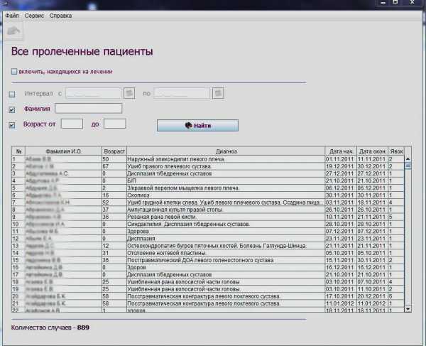 Меню Файл → Поиск больного открывает панель позволяющую найти когда либо обращавшегося к Вам пациента. Чекбоксы включают критерии поиска – охватываемый интервал, фамилия или первые ее буквы, возрастной интервал.