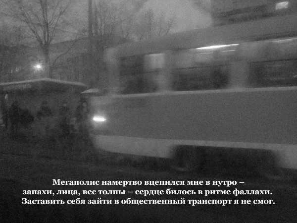 Э: И имя этому нечто...?НК: Агорафобия. Я был на третьем курсе и то, как поет эта птица, представлял себе смутно. В день ее дебюта на моей сцене я пошел со своими знакомыми в торговый центр. Мы были у входа, когда я почувствовал тошноту вполне насущного, не призрачно-экзистенциального рода. Зайти внутрь мне уже не посчастливилось. Откупившись от знакомых, я сел в парке, чтобы перевести дух, но мегаполис намертво вцепился мне в нутро – запахи, лица, вес толпы – сердце билось в ритме фаллахи. Заставить себя зайти в общественный транспорт я не смог, что и говорить про метро.