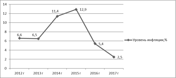 Так, если в 2013 г. уровень инфляции составлял 6,5 %, то в 2014 г. уже — 11,4 %, а к 2015 г. данный показатель вырос практически вдвое, достигнув отметки в 12,9 % [5].