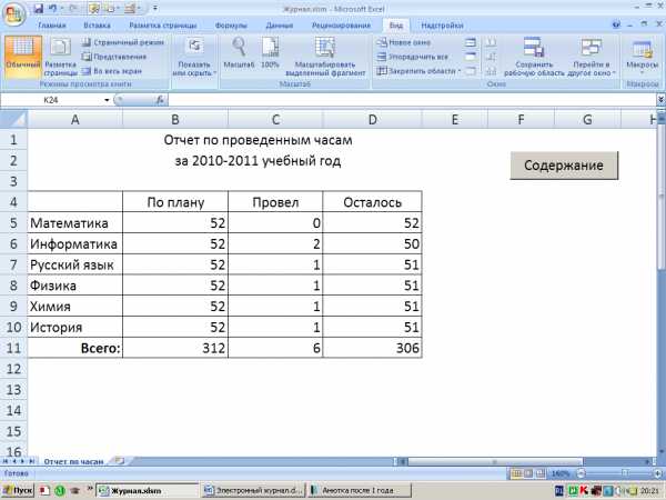Отчет по проведенным часам будет состоять из таблицы, столбцы которой будут называться По плану, Провел, Осталось. В данных столбцах будут отображаться количество часов, соответствующее государственному стандарту, количество проведенных и оставшихся часов по каждому из предметов. Строки будут включать в себя названия предметов. Последняя строка будет итоговой по всем предметам.