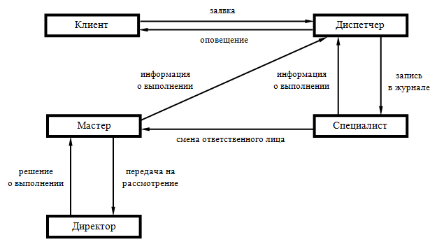 При поступлении заявки от клиента диспетчер (сотрудник сервисного центра) фиксирует требование в журнале заявок. После этого специалист сервисного центра приступает к выполнению заявки. Если в процессе выполнения у него возникают трудности в решении поставленной задачи, то он передает данную заявку мастеру, если трудностей нет — исполняет заявку и делает соответствующую запись в журнале.
