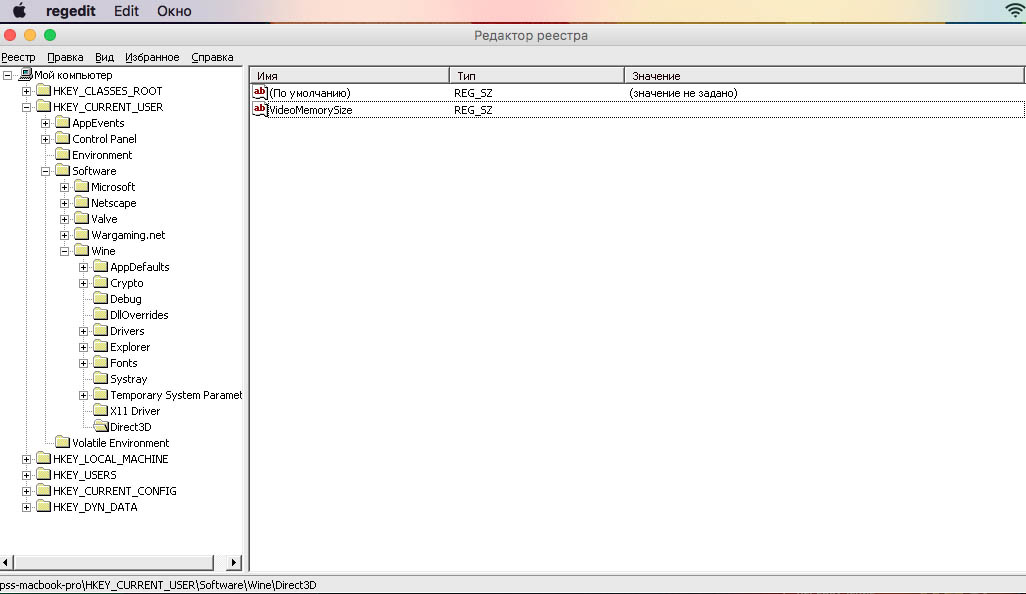 - Откроется окно редактора реестра. Откройте в дереве слева «Мой компьютер» > HKEY_CURRENT_USER > Software > Wine > Direct3D.