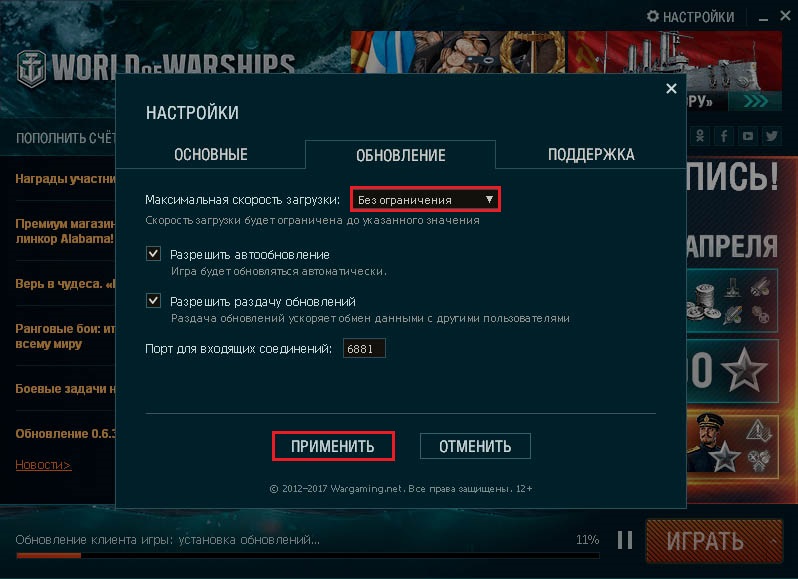 - Перейдите на вкладку «Обновление». В графе «Максимальная скорость загрузки» установите скорость загрузки, равную действительной скорости вашего подключения, и примените изменения: